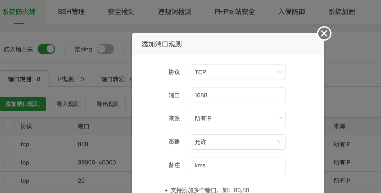 如果出现错误:0xC004F074 无法激活的情况,是服务器防火墙导致,如果确定服务器已经开放了1688端口,那就去把宝塔的防火墙关闭了。