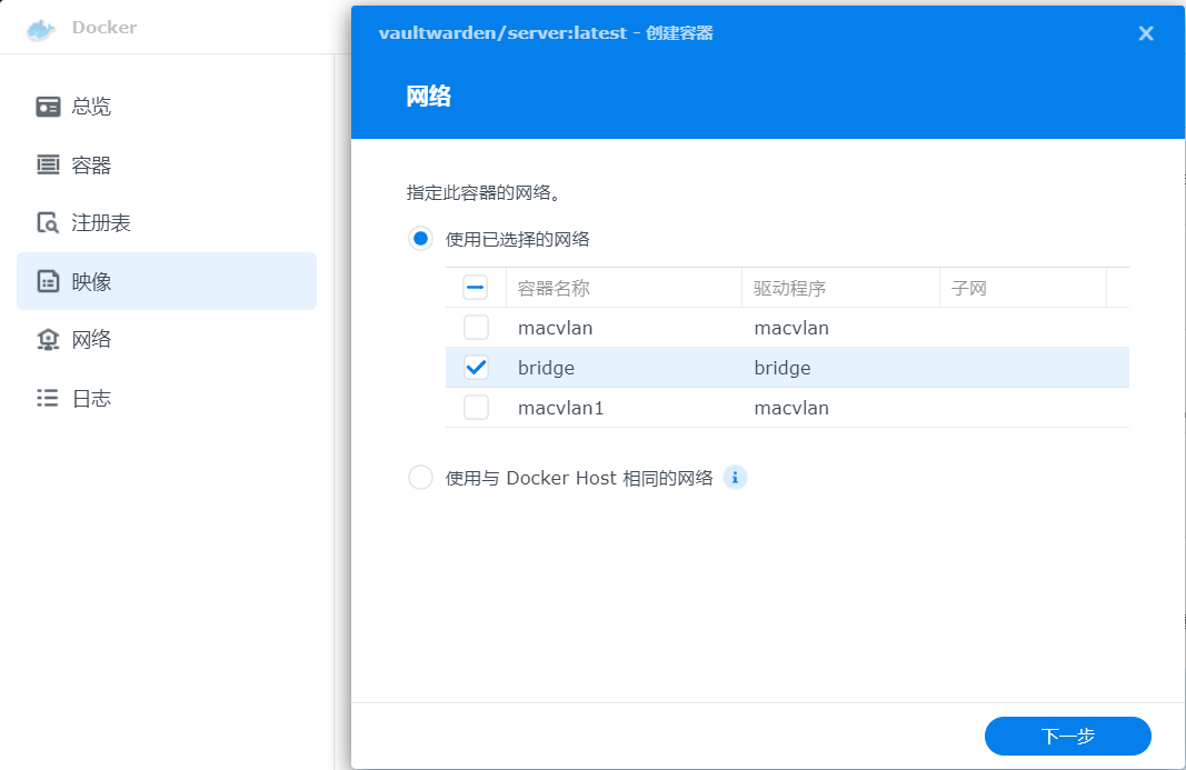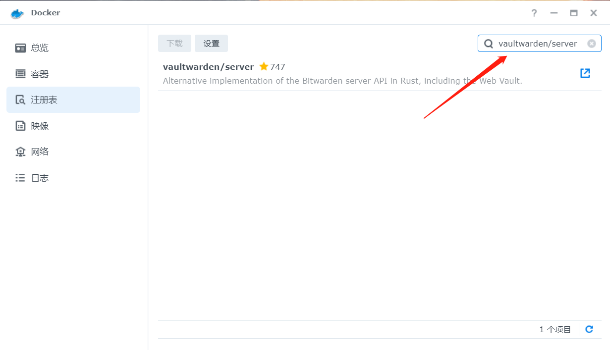 1、群晖Docker注册表搜索:vaultwarden/serve,下载镜像。