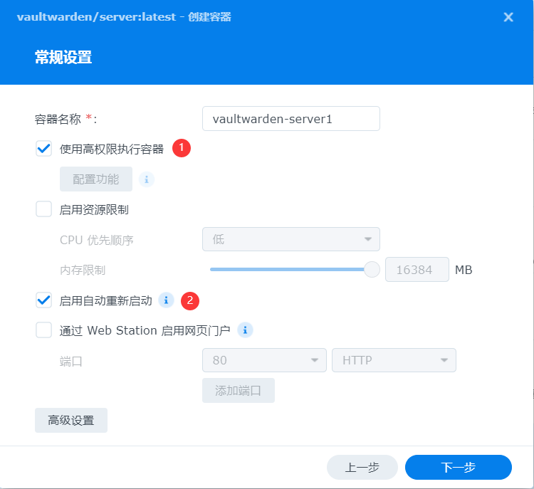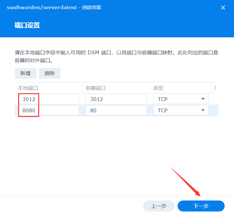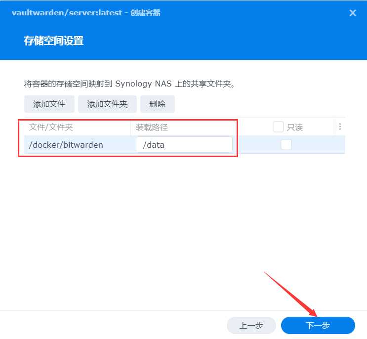 3、根据实际情况填写端口,添加Docker目录 /docker/bitwarden,装载路经/data,点下一步完成,这里就配置好了容器。