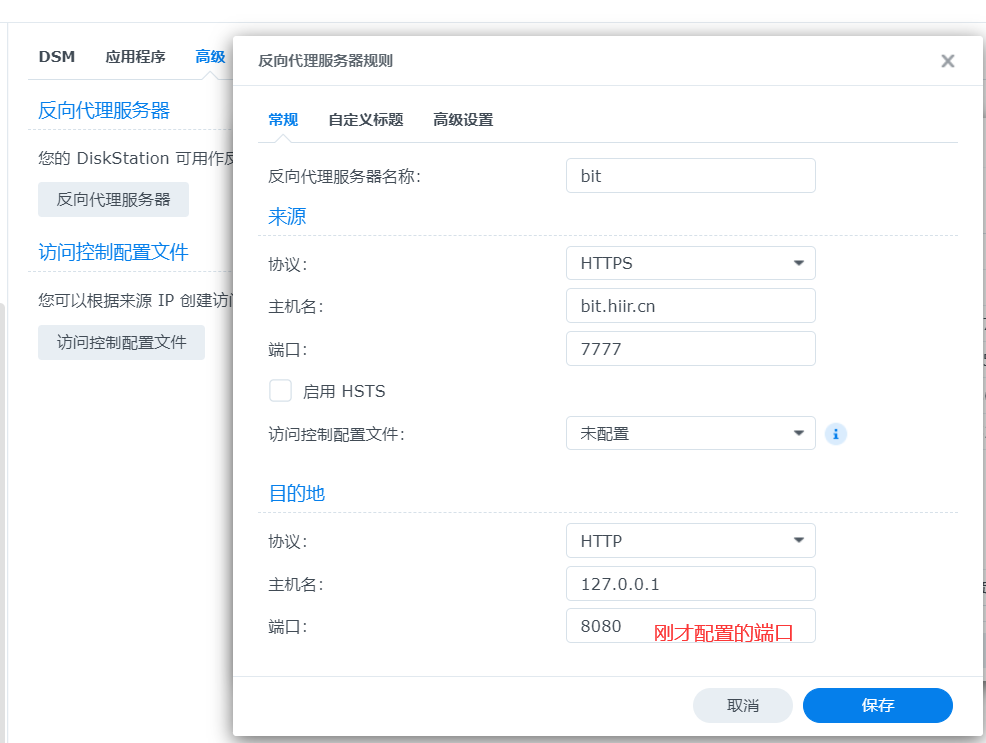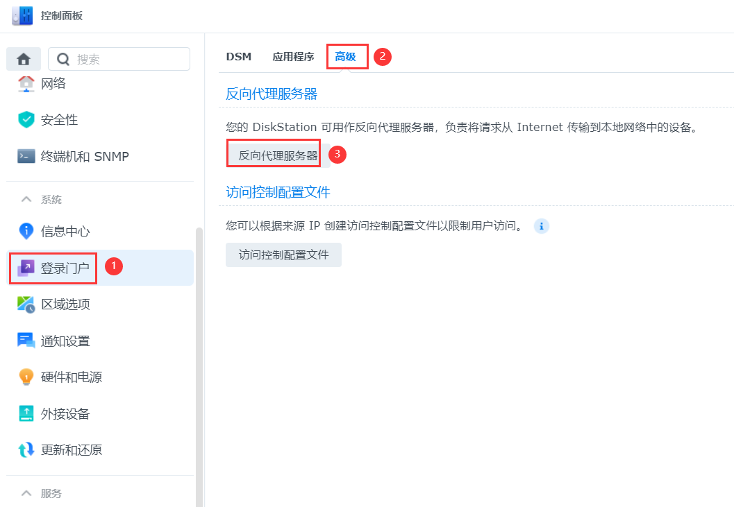 4、下面开始配置群晖反代,群晖控制面板,选择登录门户,高级,反向代理服务器。新增反代。如下图: