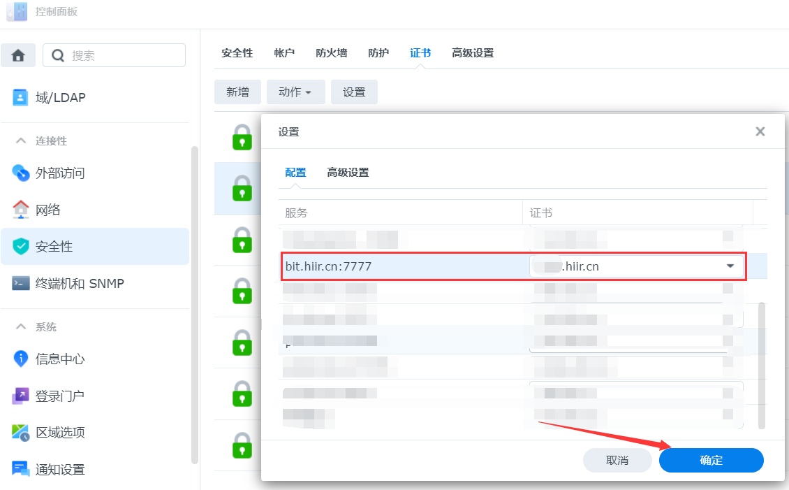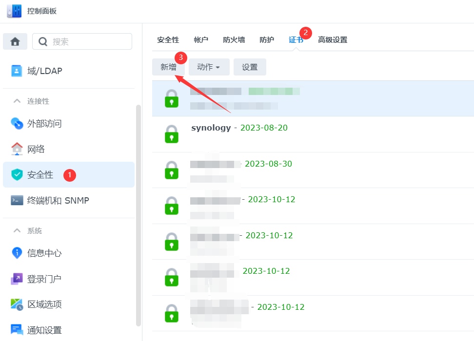 6、群晖控制面板,安全性,证书,新增域名证书。然后把证书配置给刚才反代的域名。(新增证书自行申请,网上很多免费的)