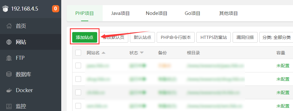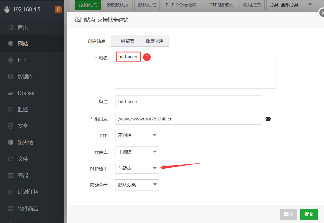 2、打开宝塔,添加站点,填写好域名,选择纯静态网站保存。如下图所示: