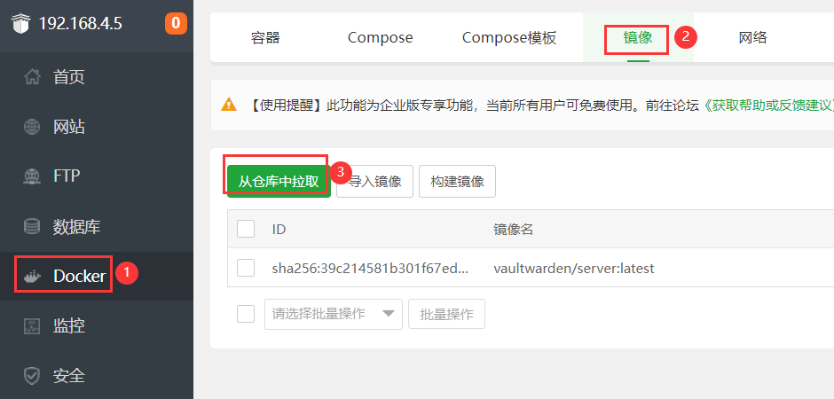 3、宝塔打开Docker,选择镜像,从仓库拉取,添加镜像名:valutwarden/server,或者:bitwardenrs/server:latest如下图所示: