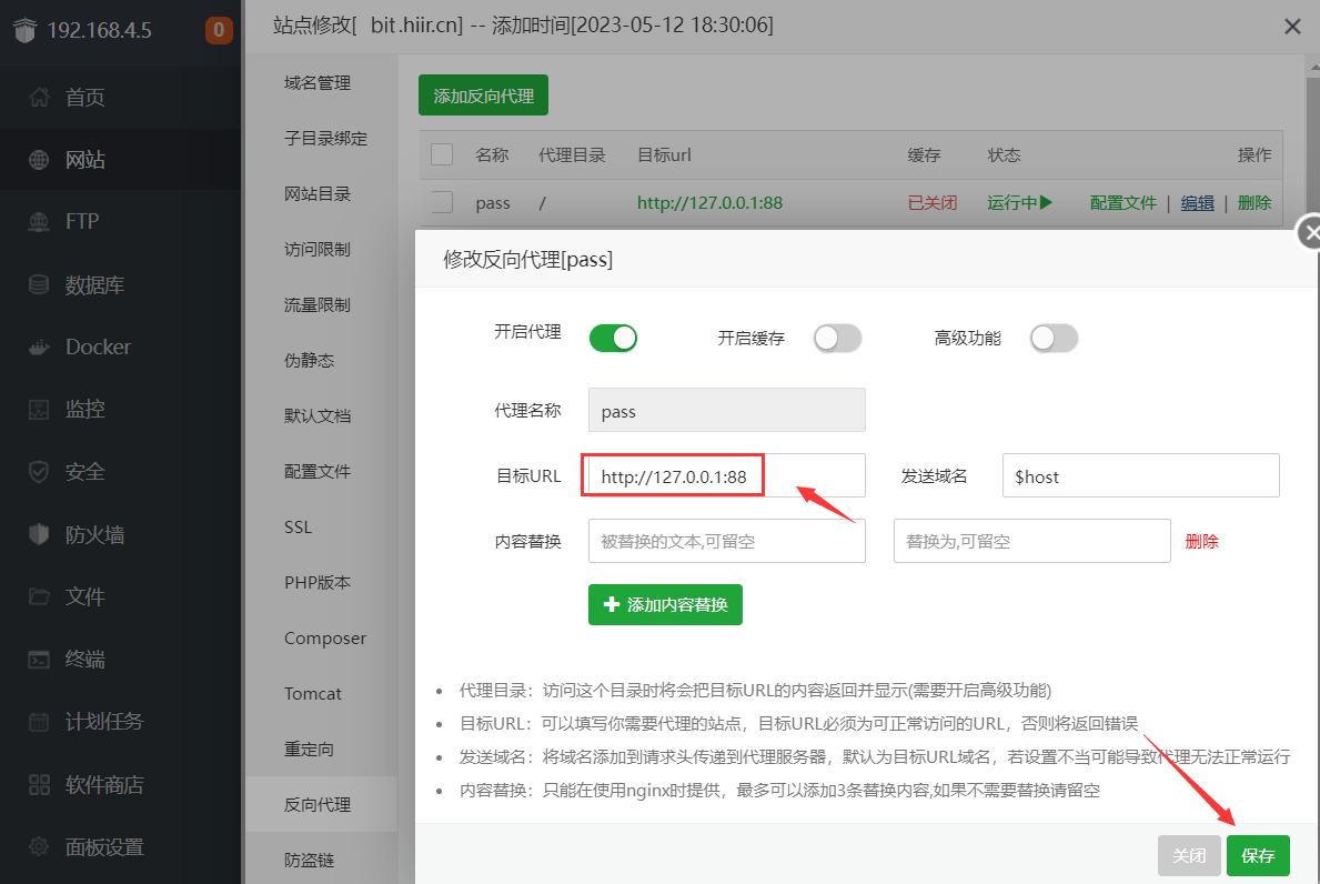 5、点击左侧反向代理,添加代理,目录URL填写127.0.0.1,端口为刚才添加容器创建的端口。如下图: