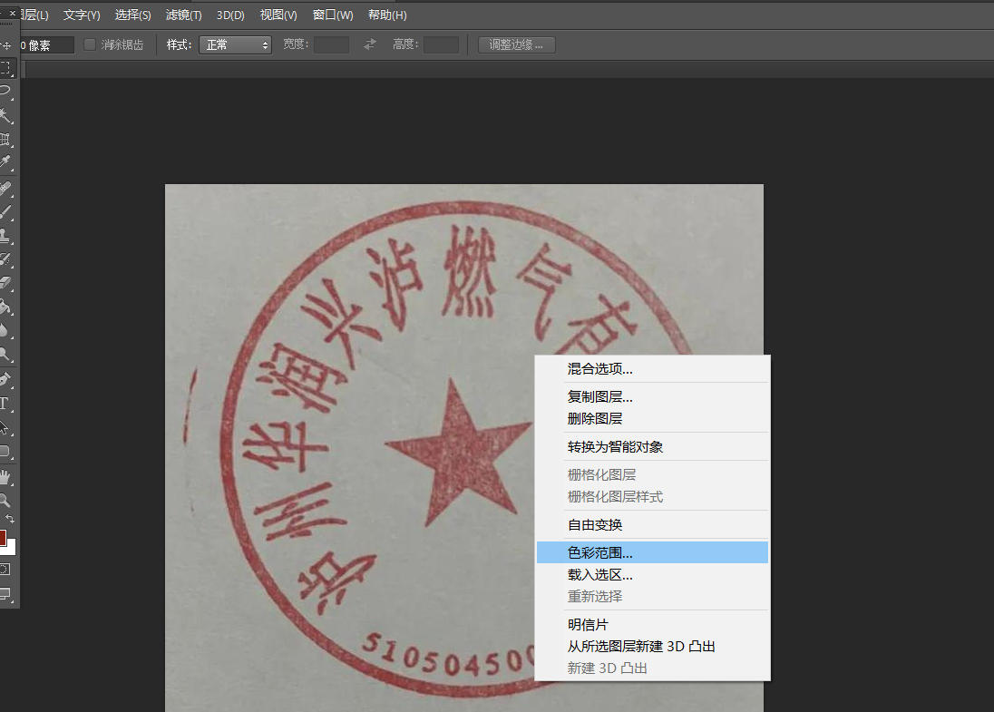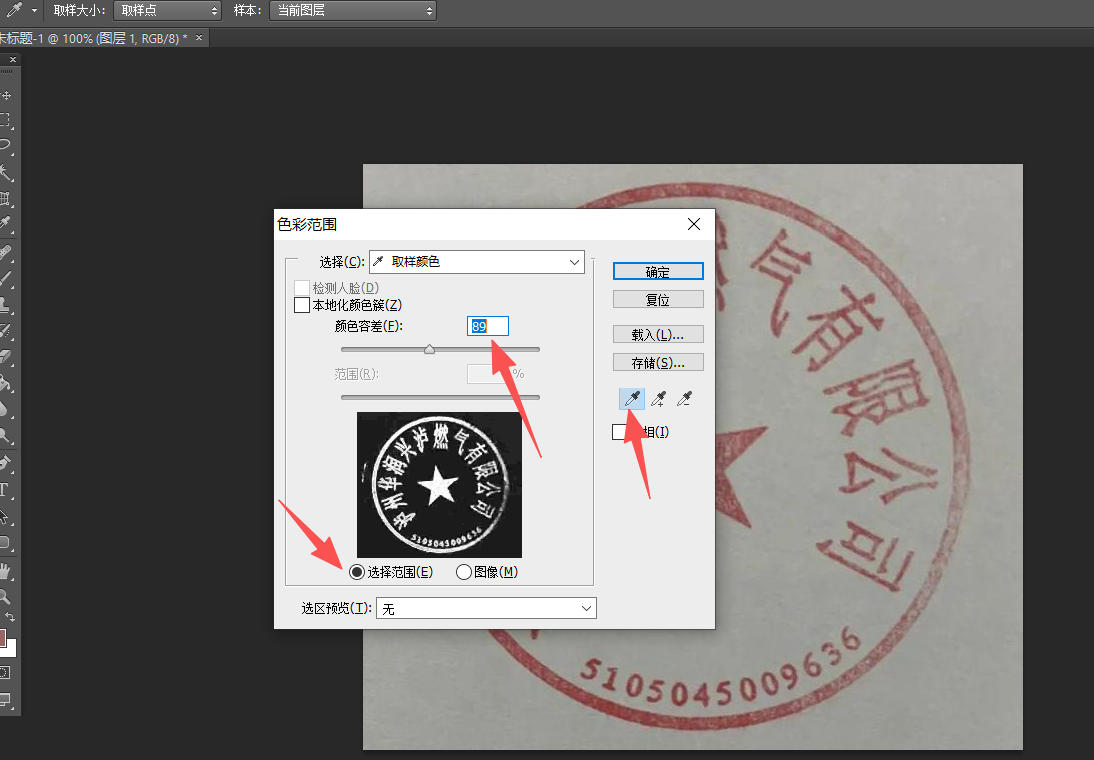 用photoshop无损抠取公章的方法 2025-12-11 • 收集整理 • 热度 9 前言有时候客户传的资质文件要转换格式造成公章变色,需要用到鲜章。现把收集到的抠公章方法整理一下备用。 抠图方法1、图片导入PS,右键选择色彩范围。如下图: 2、选择色彩范围。然后用吸管工具吸取红章颜色,再用吸管+工具吸取不是特别明显的区域。最后拉动容差条看下面的变化,调整到合适区域。如下图: 3、最后点击选择菜单,选择选取相似。 4、ctrl+j复制图层完工。效果如下: