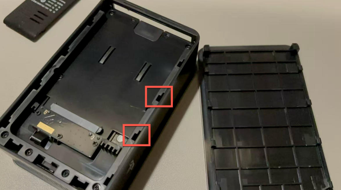 看下面图片固定的结构,侧边的盖板向下推就可以卸下来了