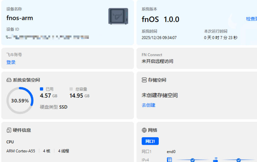 可问题也随之浮出水面:即便装上了飞牛 ARM 系统,由于镜像直接写入,可用空间依然被困在 6G 左右的窄巷里。扩容后的 eMMC,仿佛被一道无形的墙隔开,空有潜力,却难以触及。